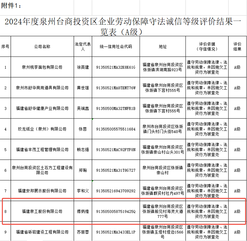 近日,根據(jù)《泉州臺(tái)商投資區(qū)管理委員會(huì)民生保障局關(guān)于開展2024年度企業(yè)勞動(dòng)保障守法誠(chéng)信等級(jí)評(píng)價(jià)的通知》(泉臺(tái)管民生文〔2025〕11號(hào))文件規(guī)定,經(jīng)嚴(yán)格審核,福建泉工股份有限公司(以下簡(jiǎn)稱“泉工股份”)被評(píng)定為“2024年度企業(yè)勞動(dòng)保障守法誠(chéng)信等級(jí)A級(jí)企業(yè)”,成為全區(qū)25家獲此殊榮的企業(yè)之一。